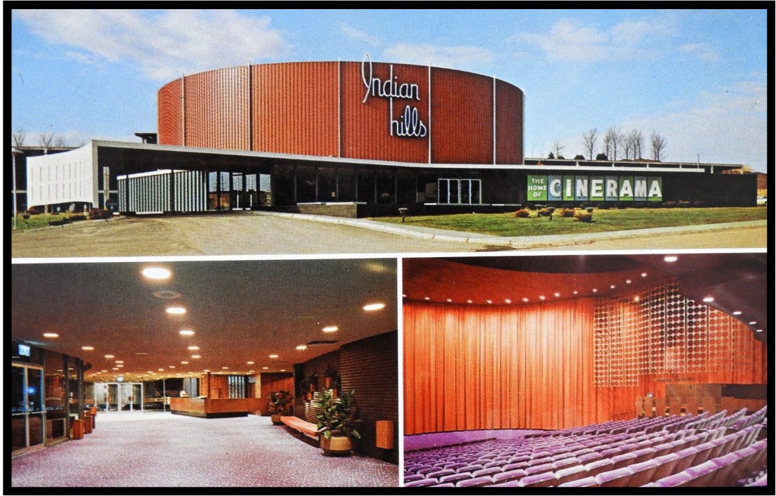The Indian Hills was one of three round “hatbox” theaters designed and built by a company called Cooper for Cinerama. (The other two Cooper hatbox theaters were located in Denver and Minneapolis). It could seat slightly over 800 patrons and featured a large curved screen that was 105 feet wide and 35 feet tall. It also had a 6 track sound system and an acoustical ceiling, so the sound in this theater was amazing.