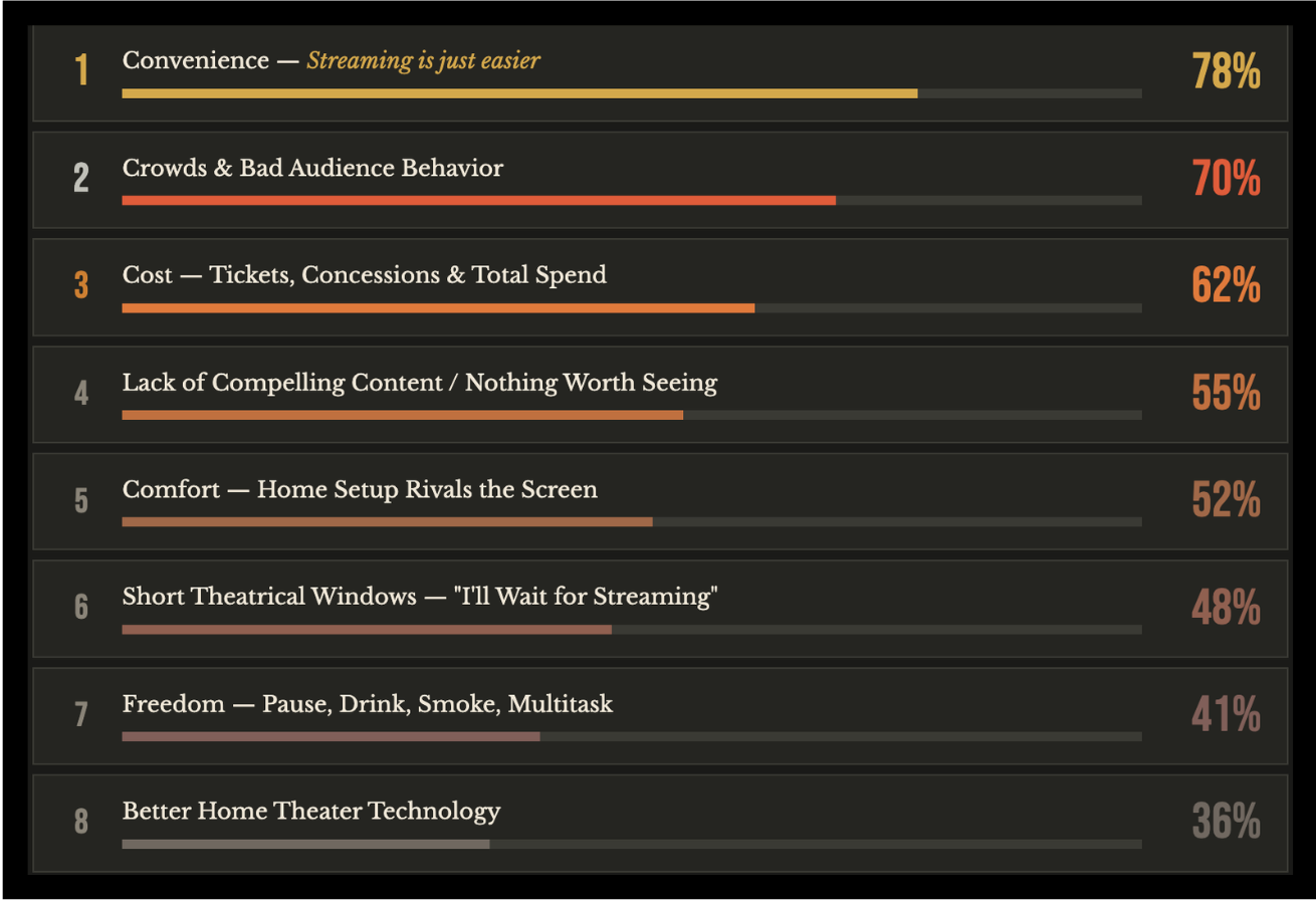 Octane Seating also notes that sales of high end home theater equipment have grown by 32% since 2023. 4K TVs, Dolby Atmos sound systems, and smart projectors have dramatically narrowed the quality gap that once made theaters feel special and unique.