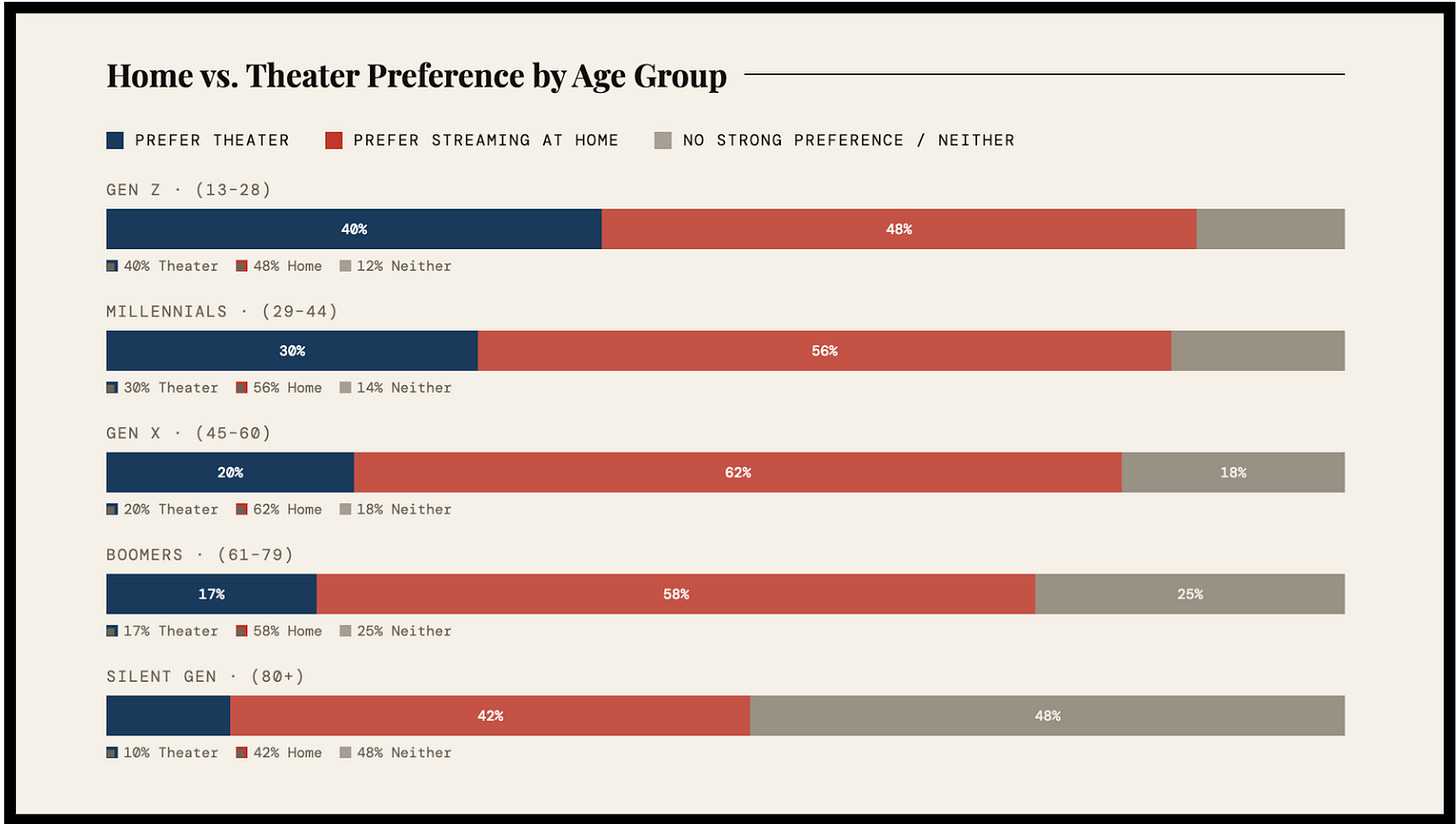 In short, today, many people in every age group (including Gen Z) prefer streaming new movies at home instead of watching them in a theater.