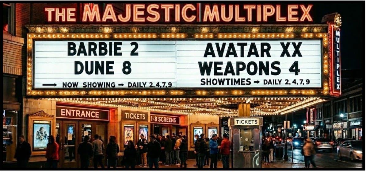 Instead, all four of our city’s multiplexes are owned by Marcus Theatres, and they all show the same four or five mainstream movies (no indie or foreign films allowed!) at each location. So if you’re like me and want to see something other than Scream 7, Wuthering Heights, Hoppers, or Bride! you’re out of luck.
