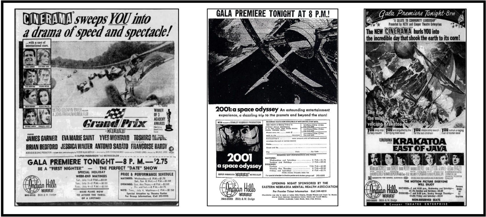 I vividly remember the experience of seeing films like Krakatoa: East of Java, Ice Station Zebra, and later when they were re-released in the 70s, Lawrence Of Arabia, Dr. Zhivago, and 2001: A Space Odyssey, which quickly became my all-time favorite film. Experiencing Kubrick’s masterpiece on a 105 foot curved screen with state of the six track stereo was truly “the ultimate trip.”