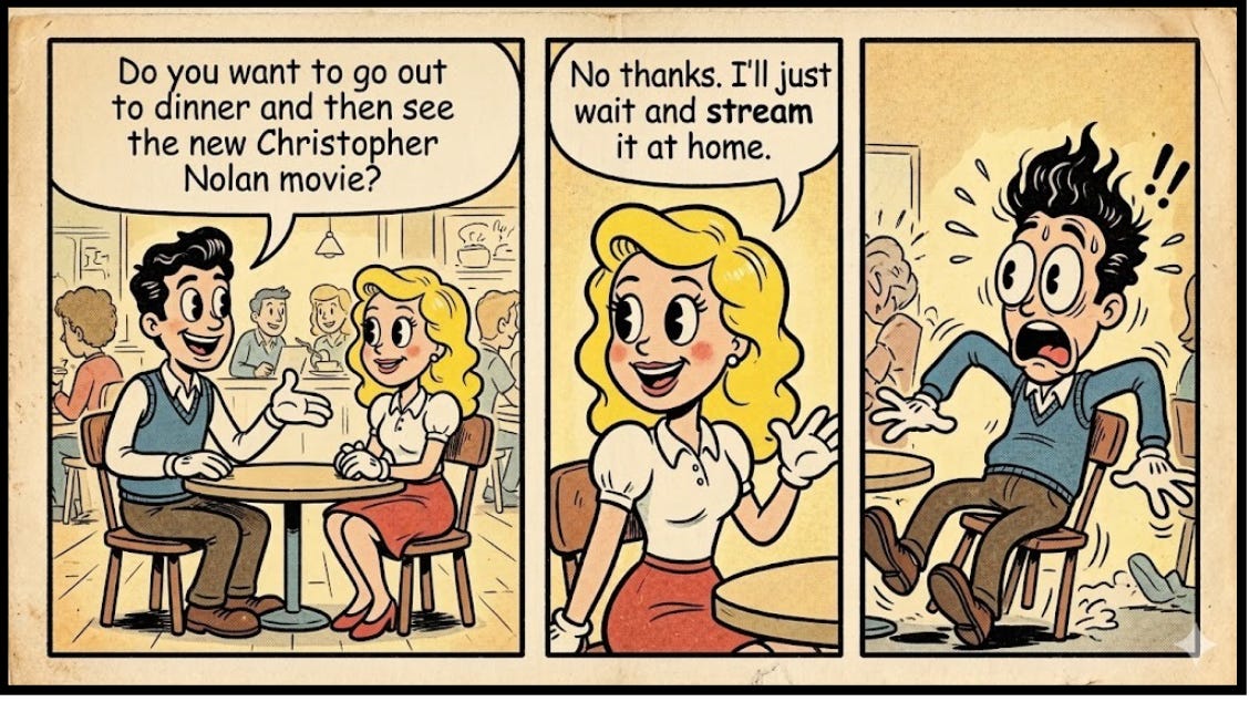 After doing some digging around, I discovered that statistics show that seventy-five percent of all adults over 21 have streamed a recently released movie in the past year instead of watching it in a theater (APNORC, August 2025).