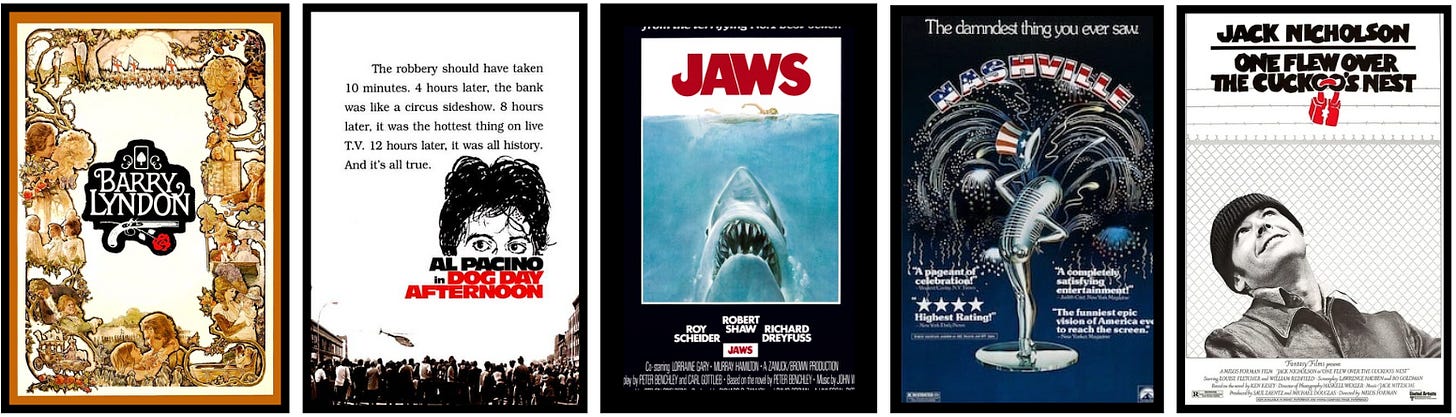 1975 was an amazing year for American movies. At the Oscars, the five nominees for Best Picture of 1975 (in alphabetical order) were: Barry Lyndon, Dog Day Afternoon, Jaws, Nashville, and One Flew Over the Cuckoo’s Nest.