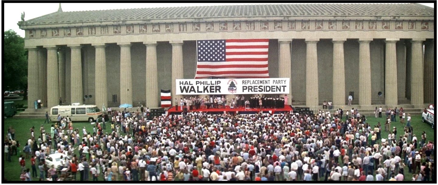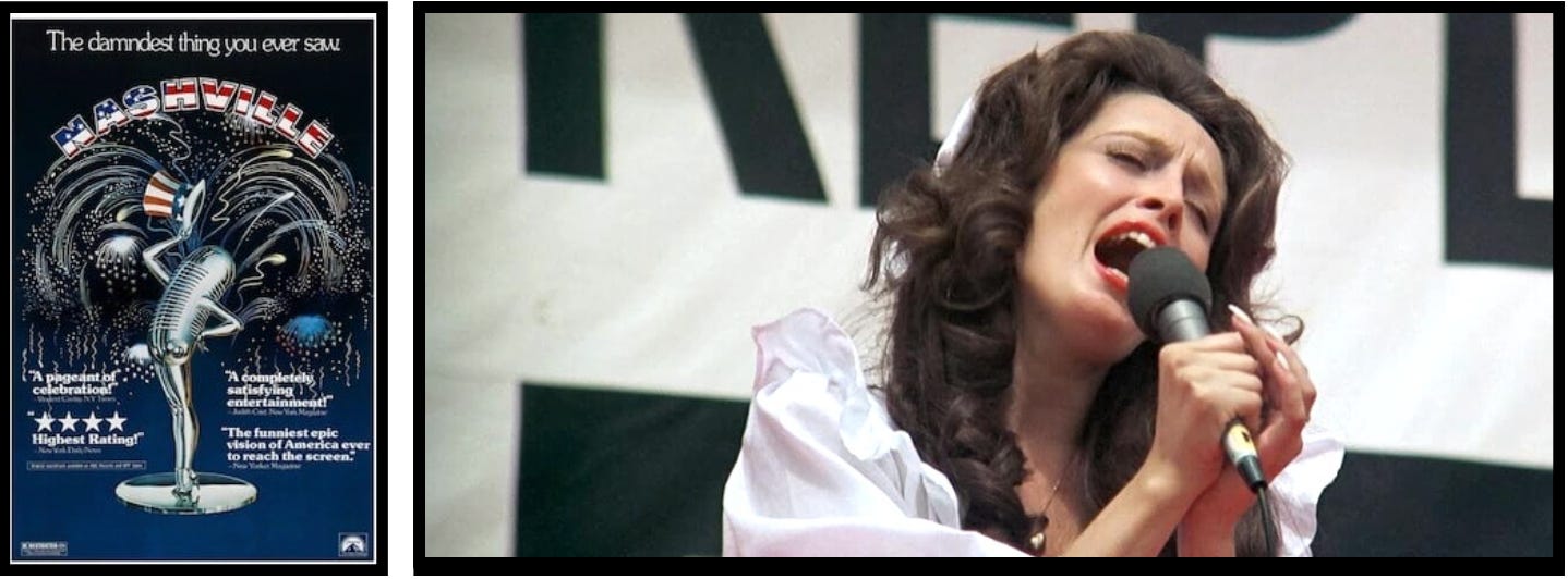The film is a musical, a satire, a tragedy, a comedy, and a portrait of a fractured America in 1975, just one year after Watergate. Among the large cast are Lily Tomlin, Ronee Blakely, Henry Gibson, Keith Carradine, Ned Beatty, Shelley Duvall, Geraldine Chaplin, Barbara Harris, Karen Black, Jeff Goldblum, Allen Garfield, and many more actors in small but integral roles.