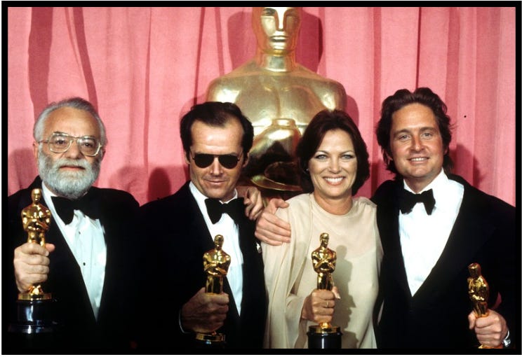 As you might know, One Flew Over the Cuckoo’s Nest swept the awards show, winning a total of 5 Oscars, including Best Picture, Best Director (Milos Forman), Best Actor (Jack Nicholson), Best Actress (Louise Fletcher), and Best Adapted Screenplay (Lawrence Hauben and Bo Goldman).
